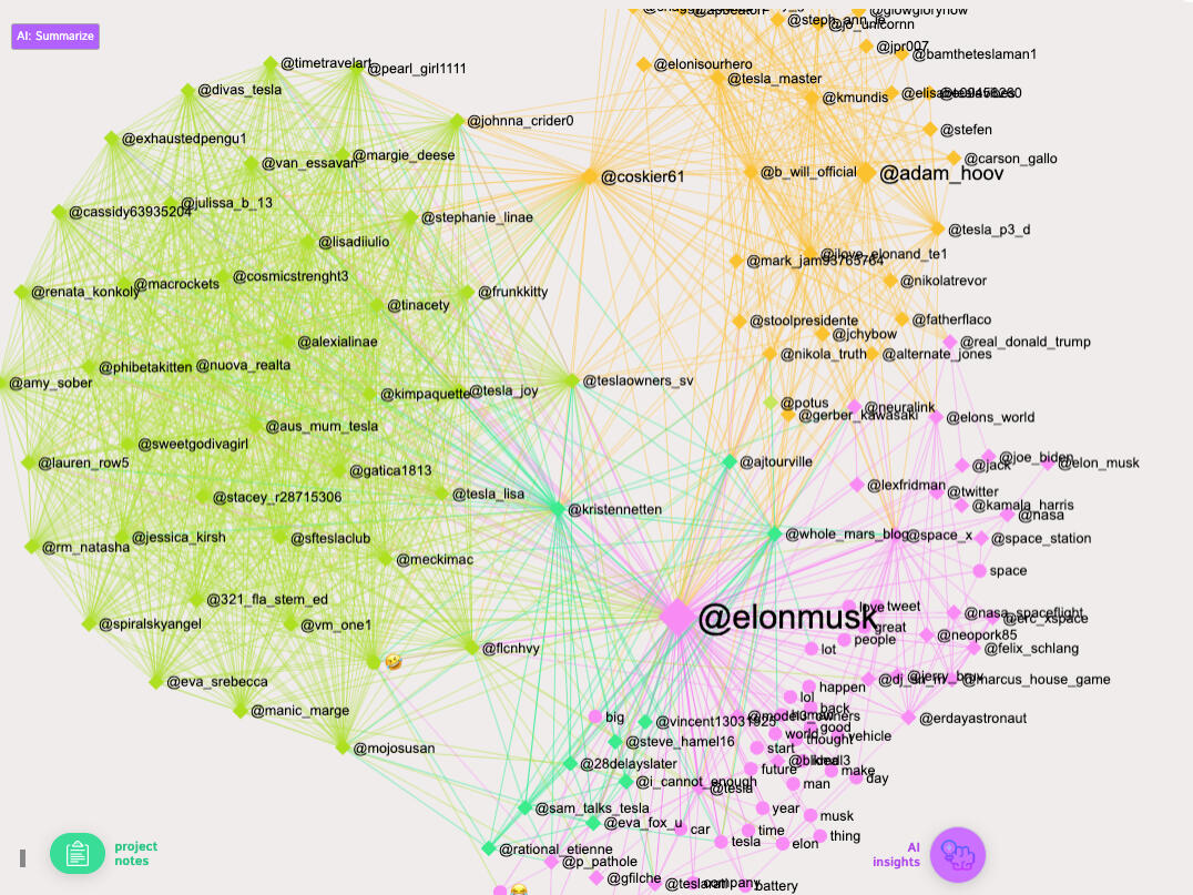 Use Case #2: Network analysis of a Twitter account Convinced Dmitry to connect Twitter API and analyze the data quickly with infranodus graphOne could use Twitter to quickly analyze the interest cluster of a social media account. The graph below is for Elon Musk. He clearly has 3 clusters of interests
