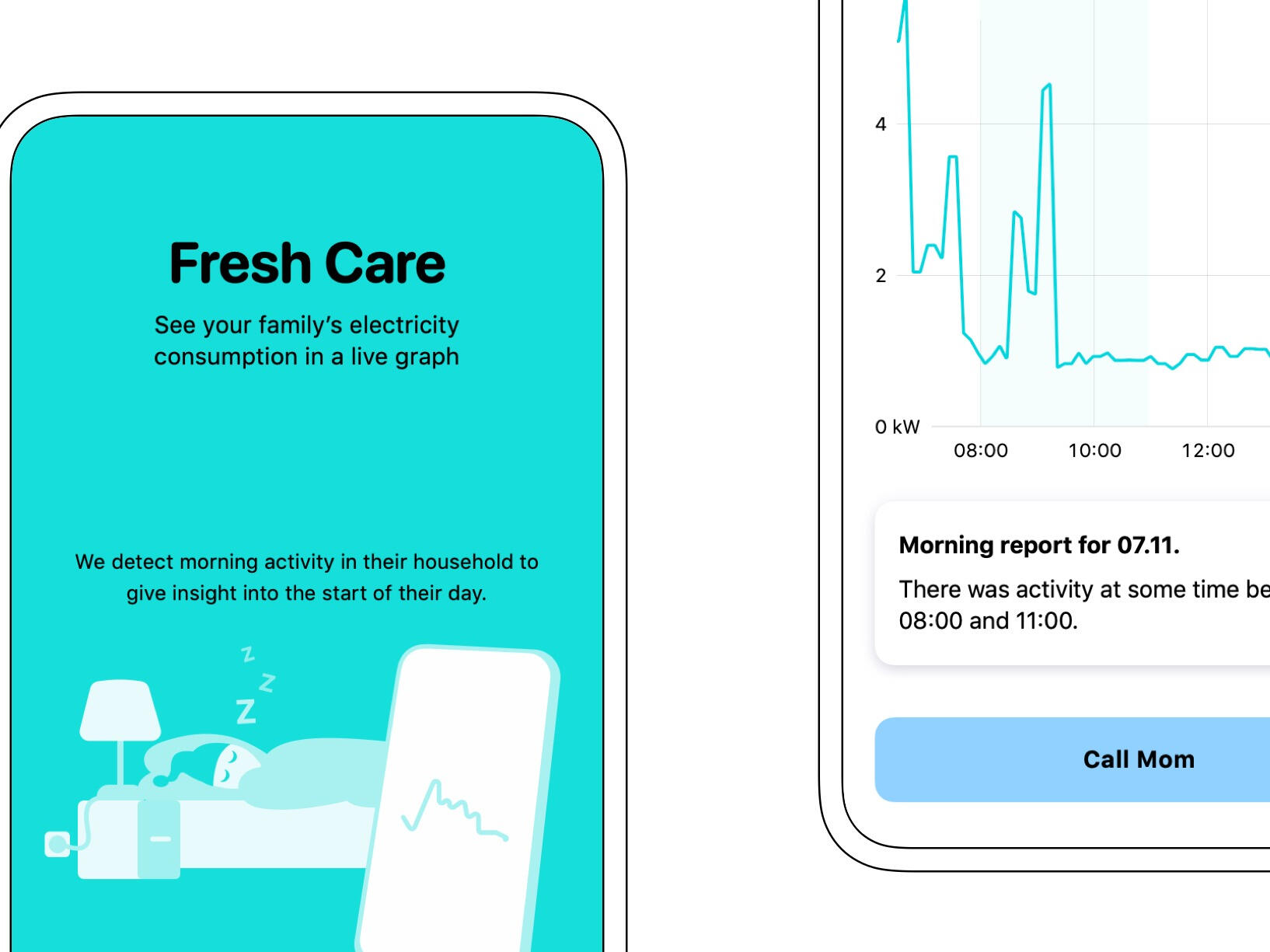 First, I facilitated workshops with the data science team to identify data and hardware limitations. Following that, user journeys (based on our personas) were used to define this innovative product within tight constraintsRESULTS- Our ideation and research identified mornings as the most critical time of day for seniors. The algorithm detects anomalous electricity use in the mornings, which may indicate well-being issues. Unlike competitors, Fresh Care needs no cameras or added hardware, so seniors feel independent and empowered. Family members receive SMS notifications about potential problems