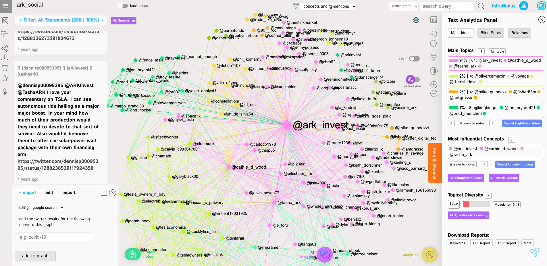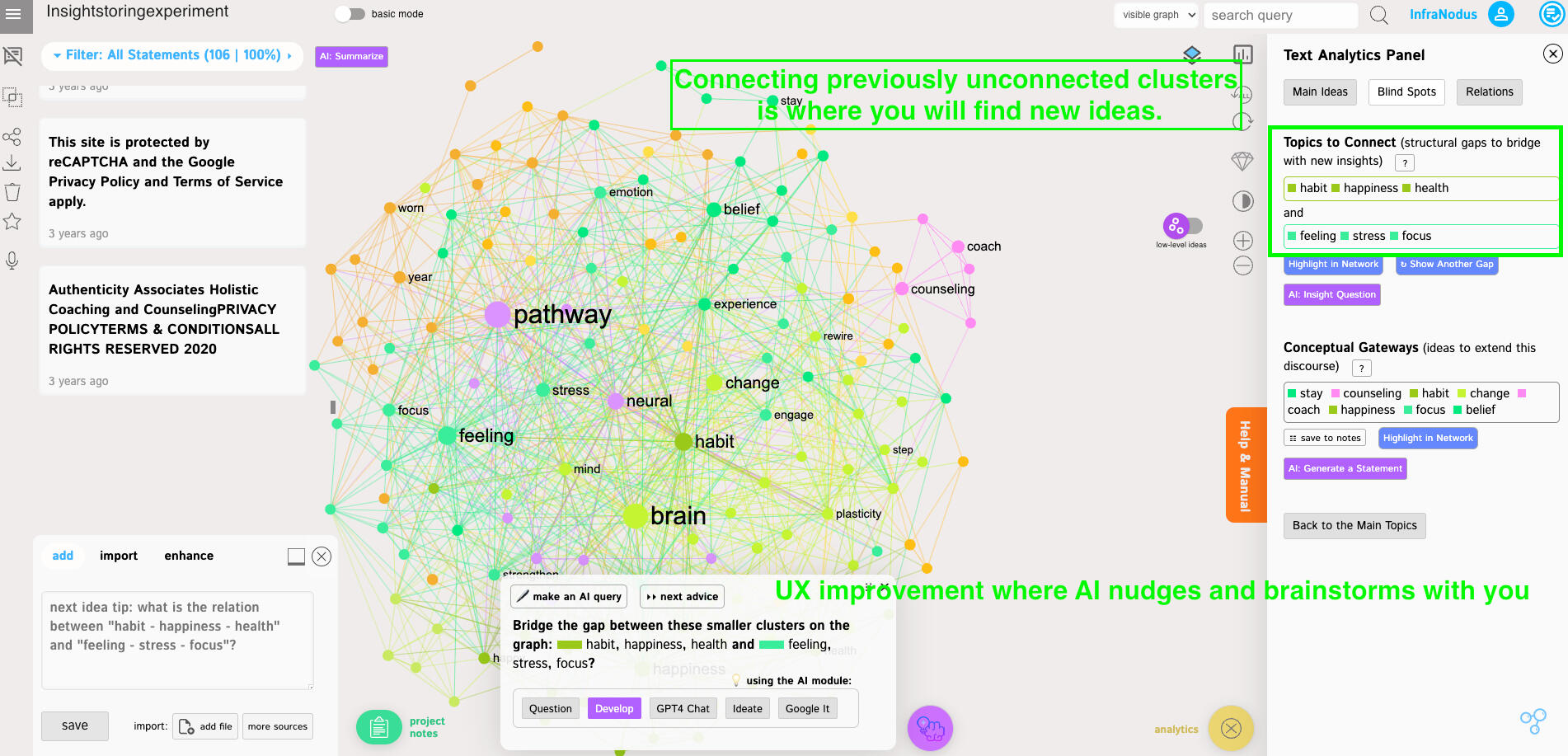 In my quest to push Infranodus to its full potential, I rigorously tested the tool, which, admittedly, led to it breaking on several occasions. This intensive process, however, bore fruit in the form of numerous new use cases. Below, I'll share a selection of these discoveries.Working closely with Dmitry, we have explored these possibilities in depth. As a result of this collaborative effort, some of these innovative use cases have now been seamlessly integrated into Infranodus, enriching the tool's functionality and user experience.