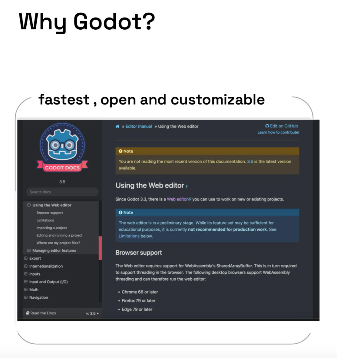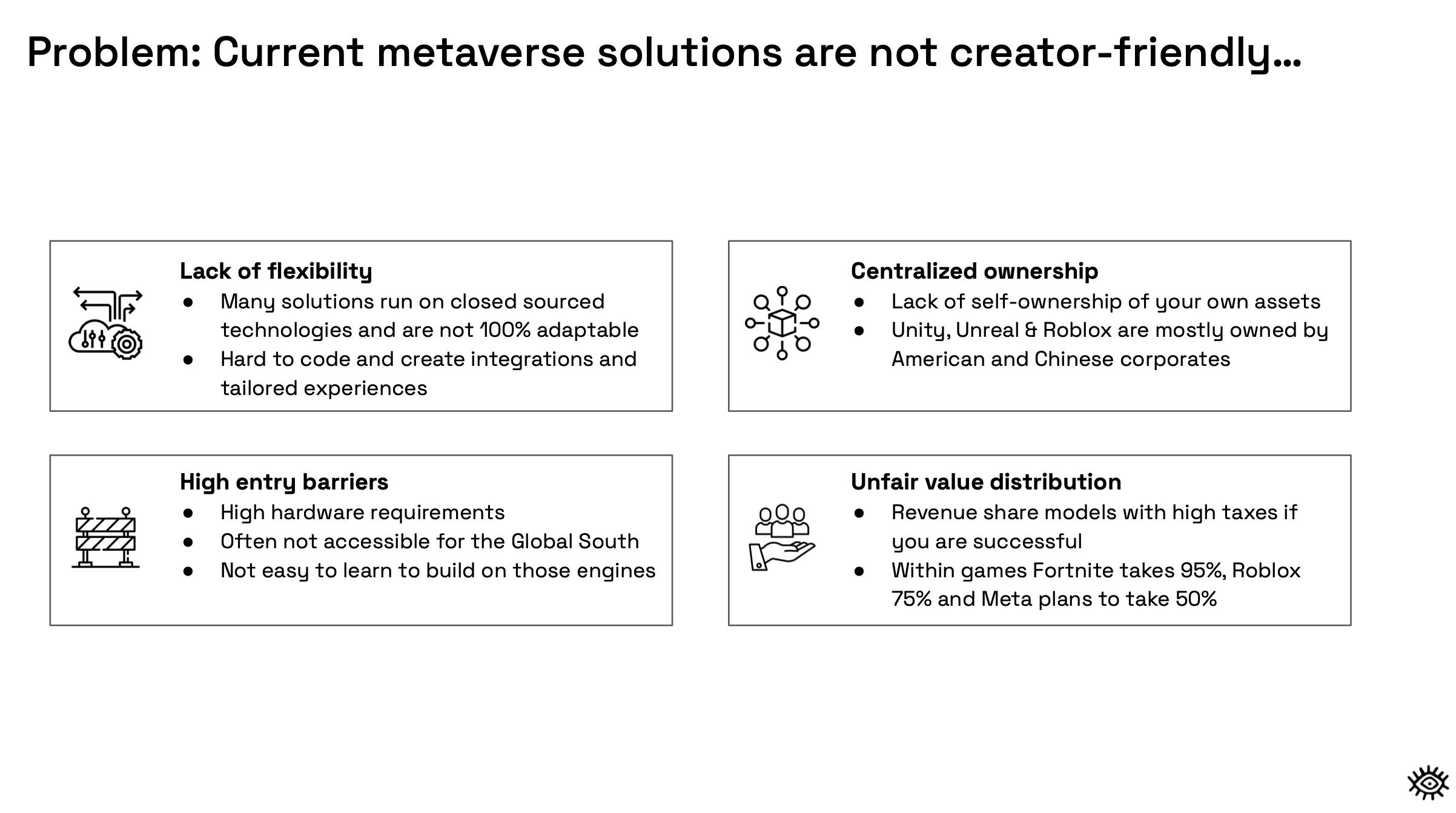 After working on 2 metaverse enterprise projects for big clients we uncovered many challenges- Lack of Flexibility: Proprietary technologies constrain the ability to adapt, making the development of integrations and bespoke experiences highly problematic.- Centralized Ownership: Control of assets remains in the hands of a few, with dominant platforms such as Unity, Unreal, and Roblox under the purview of large American and Chinese corporations.- High Entry Barriers: Demanding hardware specifications make these platforms less attainable in Global South, accompanied by formidable learning curves.- Unfair Value Distribution: Noteworthy projects are subjected to onerous revenue sharing arrangements, with Fortnite extracting 95%, Roblox claiming 75%, and Meta projecting a 50% take.- The creation of Metaverse and Games is not easy. It demands a diverse and extensive set of skills to successfully launch a product of merit. Our ambition was to democratize this process, to empower educators, students, and people from all walks of life to craft captivating 3D immersive environments.PROCESS- Our initial step involved a deep dive into the existing ecosystem, dominated by two major game engines, alongside a variety of lesser-known alternatives. We selected Godot as the foundation for our infrastructure.