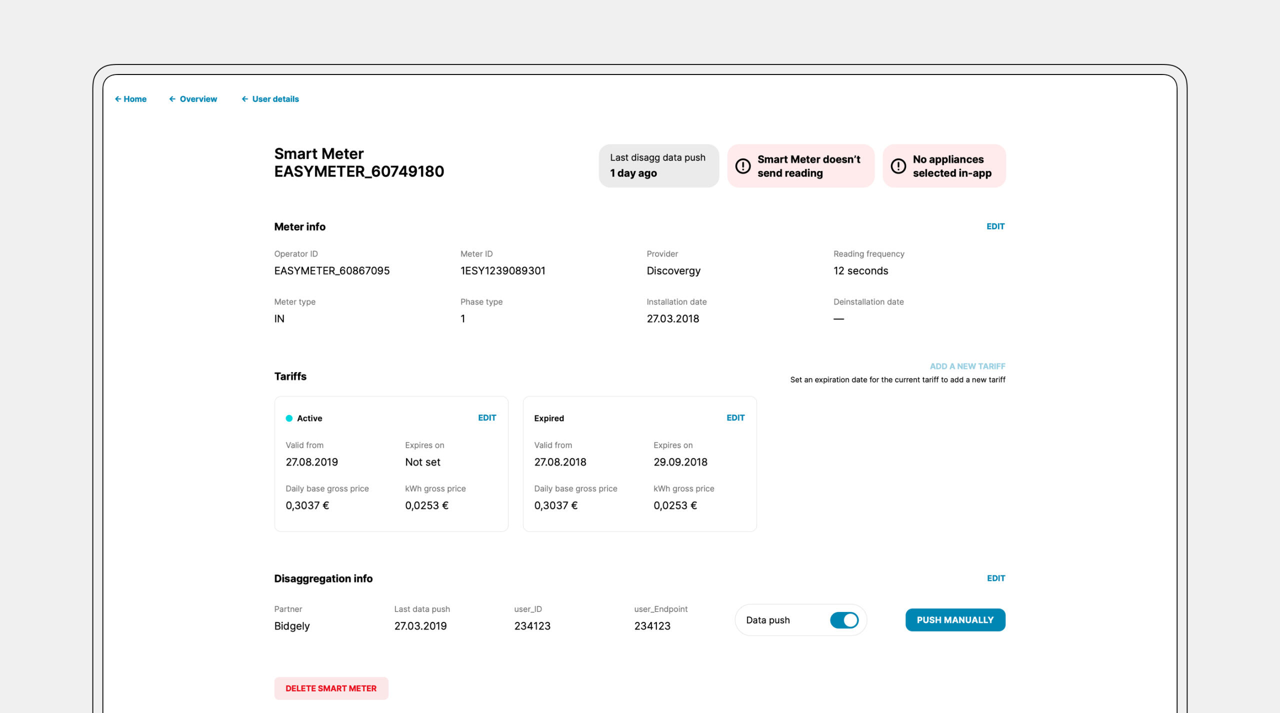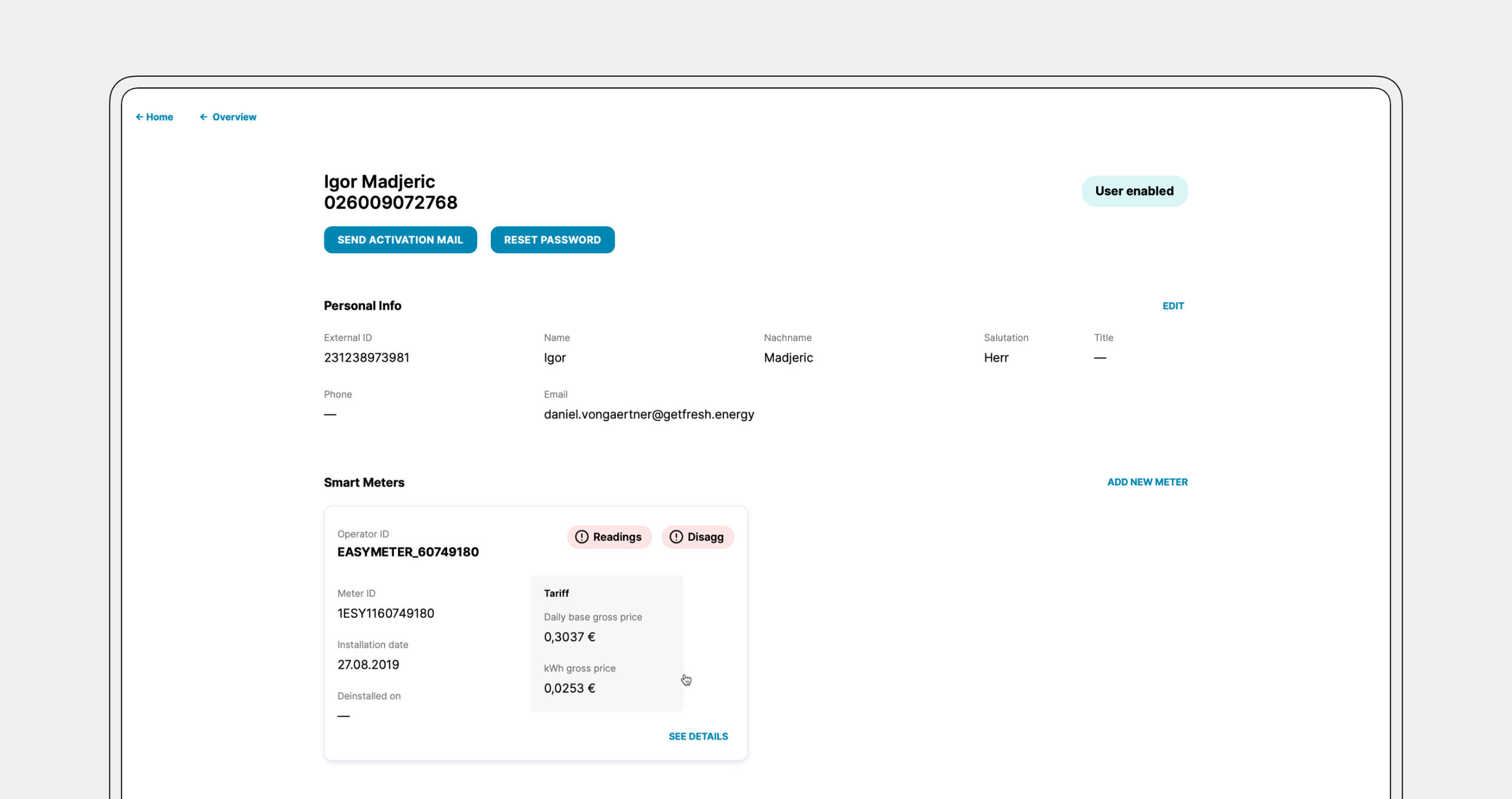 3. Admin dashboard for our partner's customer support. All users and smart meters are visible on the dashboard. Admins can quickly CRUD create, update, delete, and connect meters to users to serve their own customers