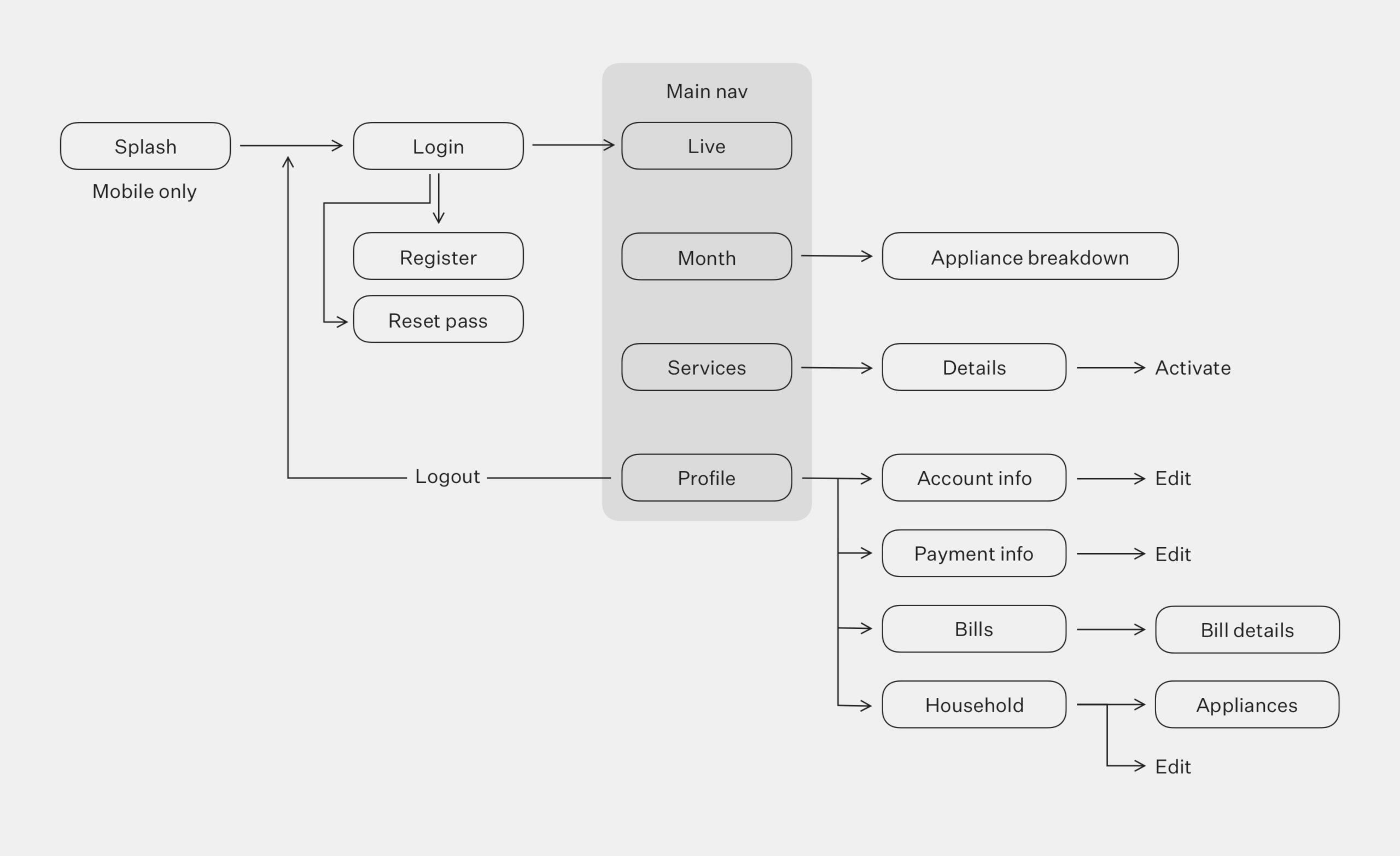 Reformed the information architecture based on user research interviews. Replaced side menu with tab bar navigation. Added profile, household info sections based on user research interviews. Added services section to support future business goals.