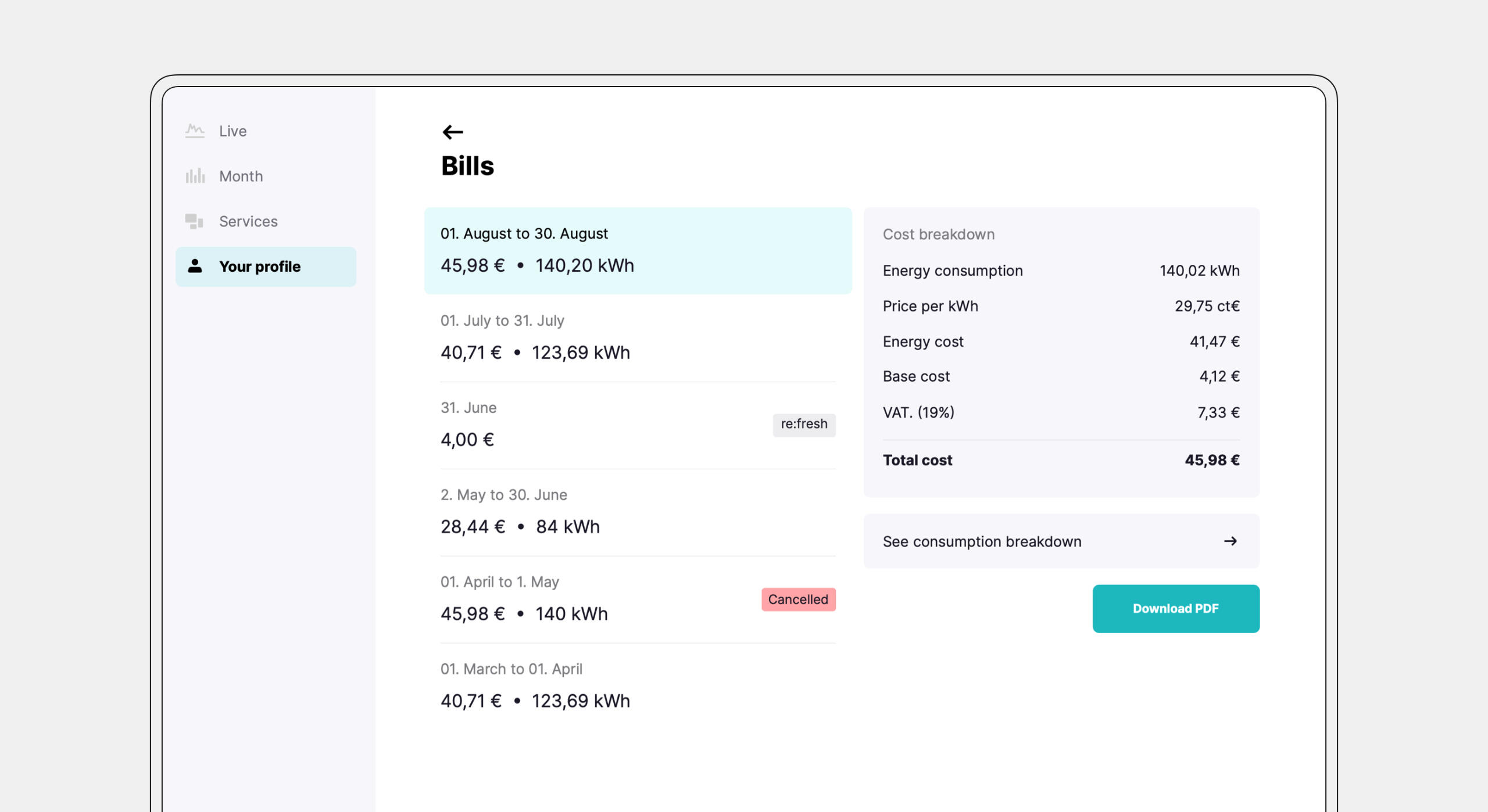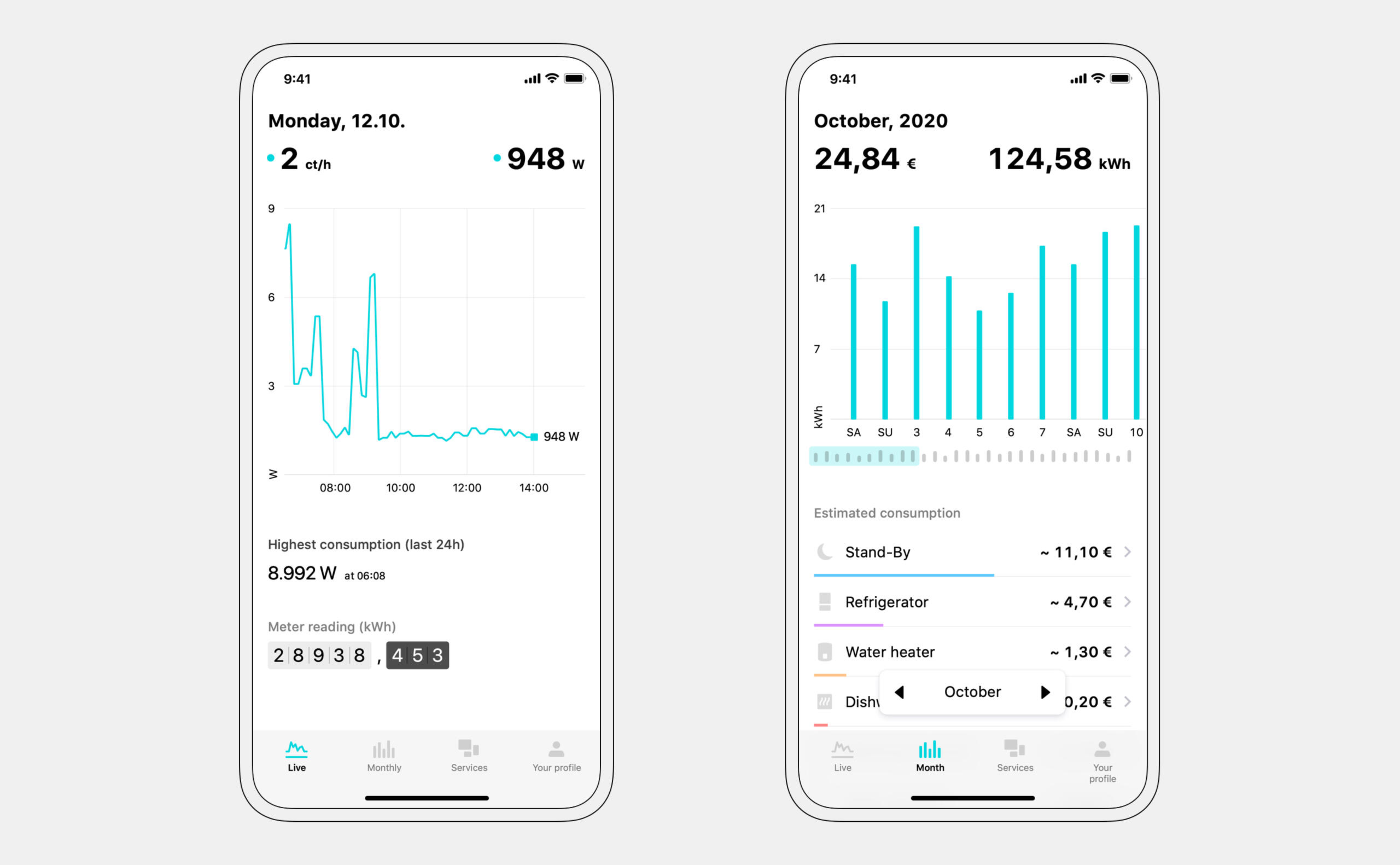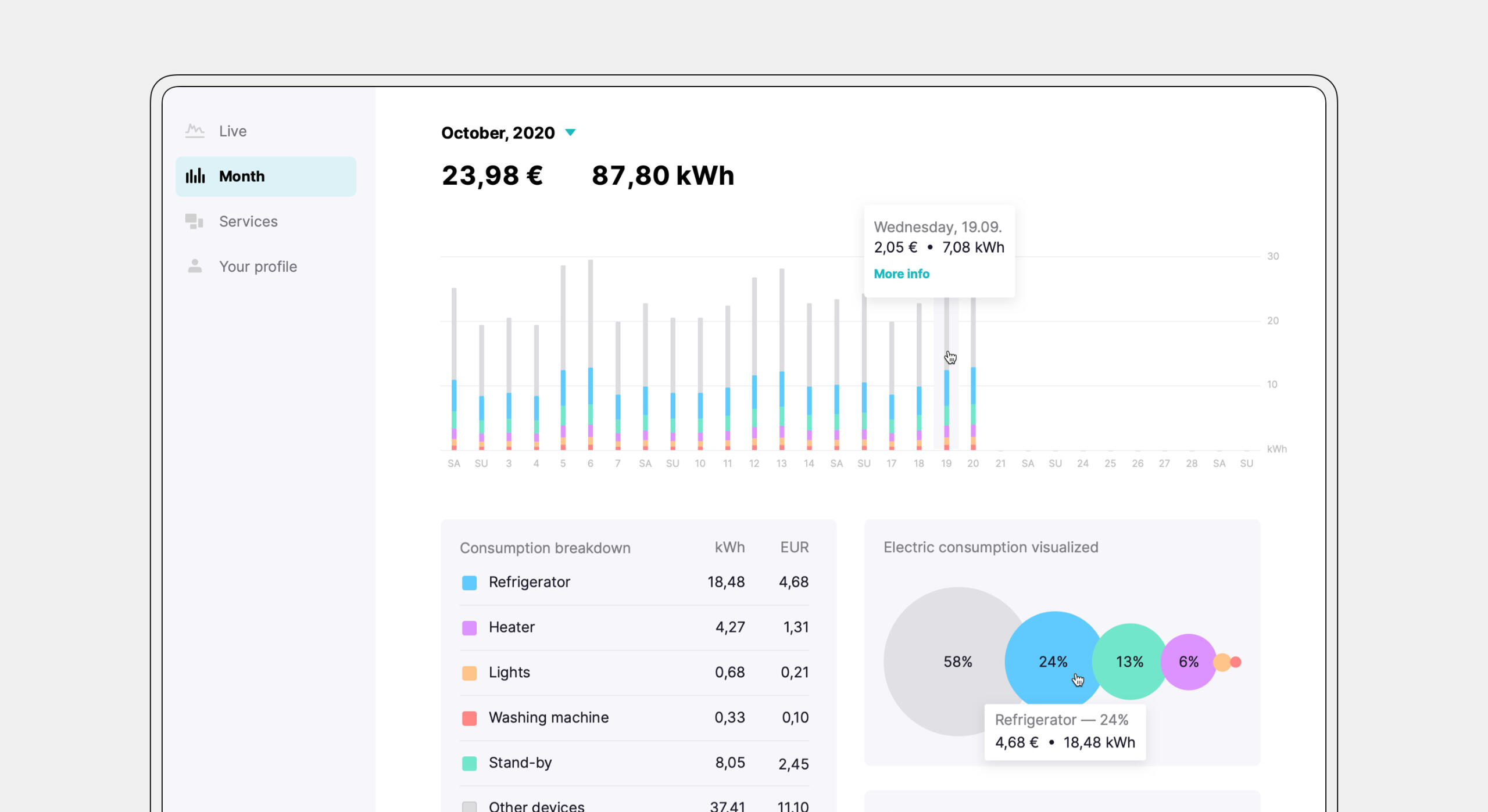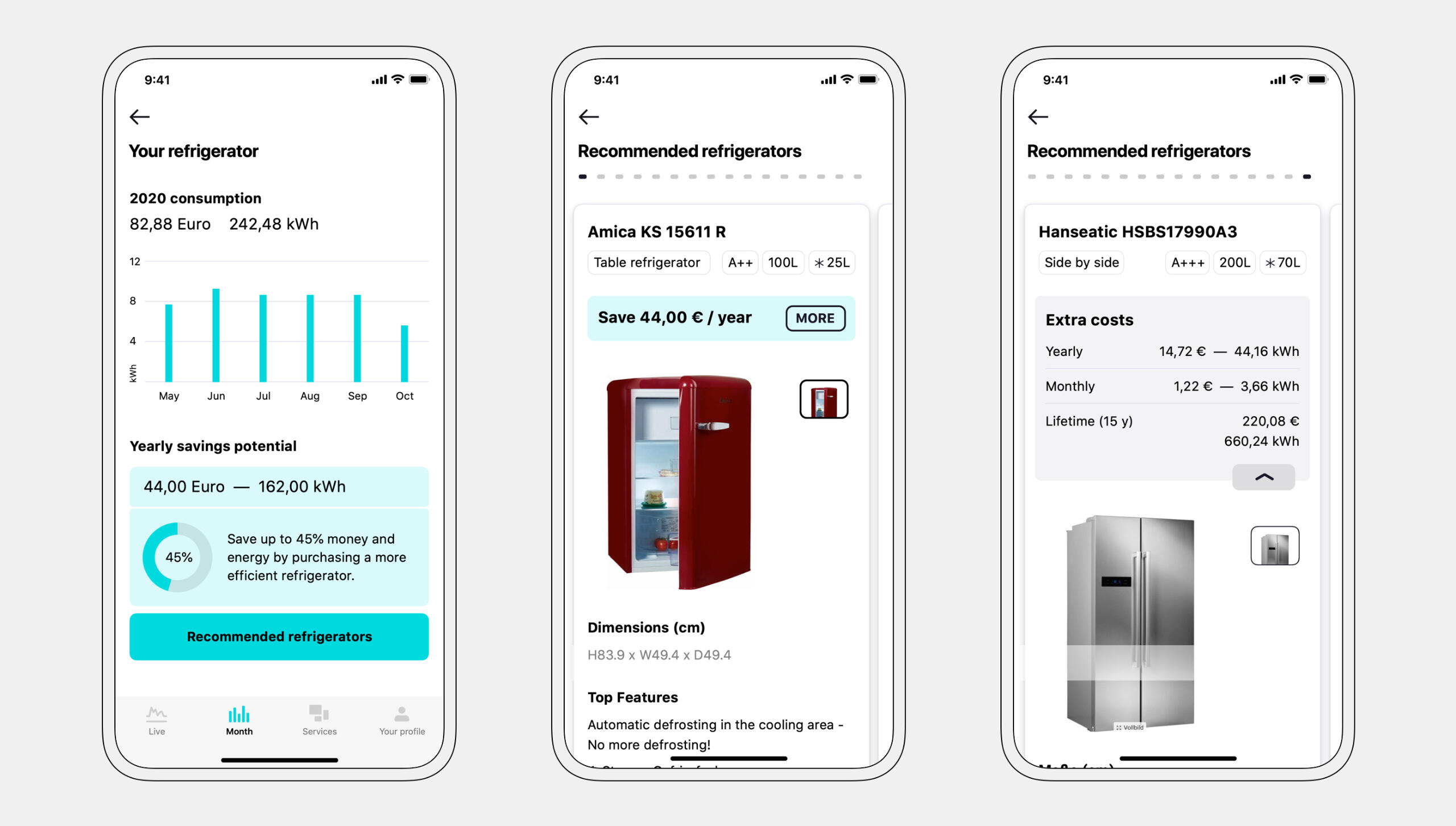 Through research and pilot projects, we found out that most of our users had no idea if their fridge spending was below or above the average for a given fridge size. The app analyzes our users' fridge consumption and compares it to our database. Based on the comparison, we calculate potential monthly savings — together with the amortization time for a new fridge.
