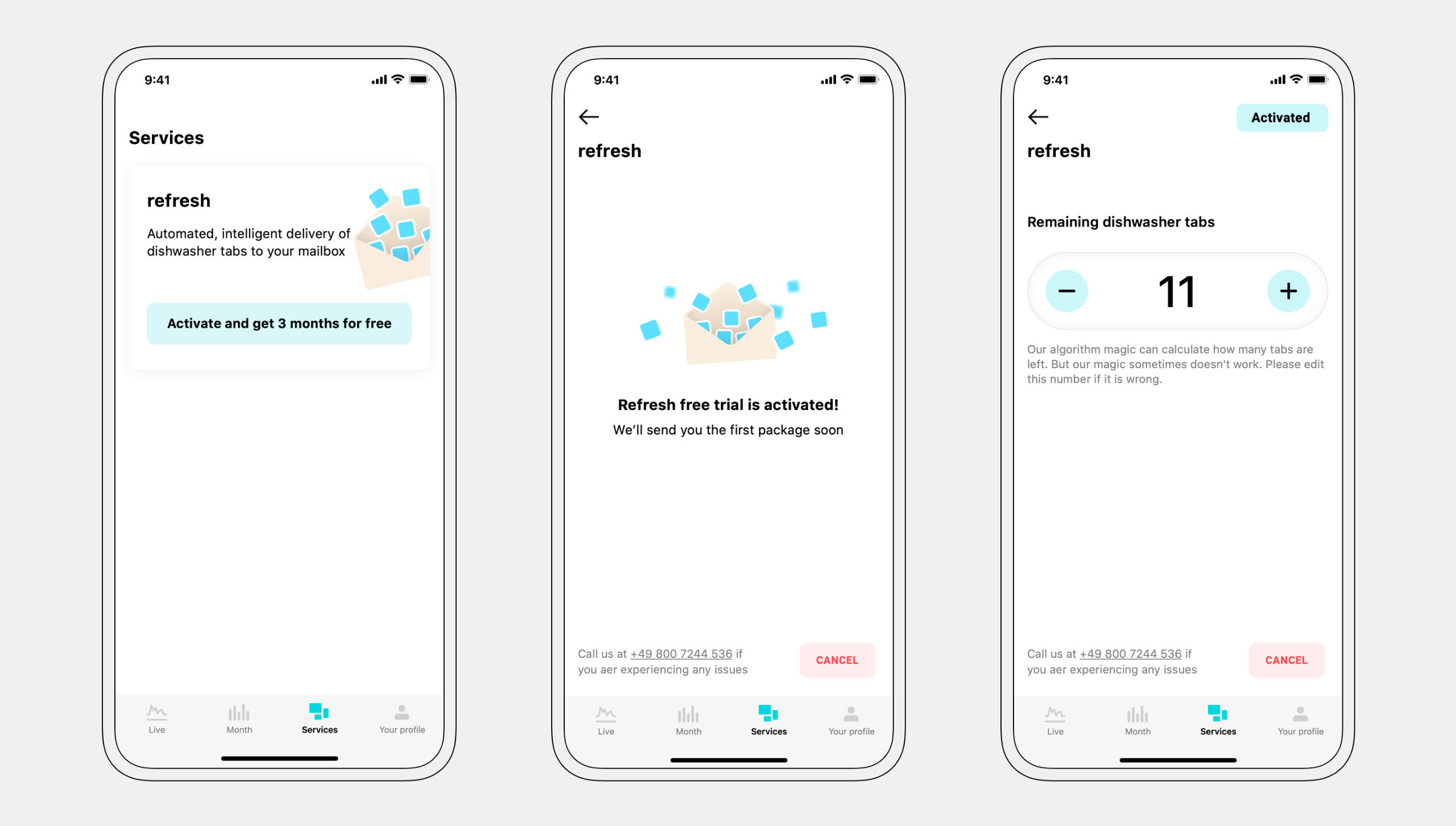 “Refresh” is a subscription service, based on existing data. An algorithm detects how many times our users use their dishwasher. A package of dishwasher tabs is automatically sent out so it arrives exactly when they run out — giving our users a magical experience