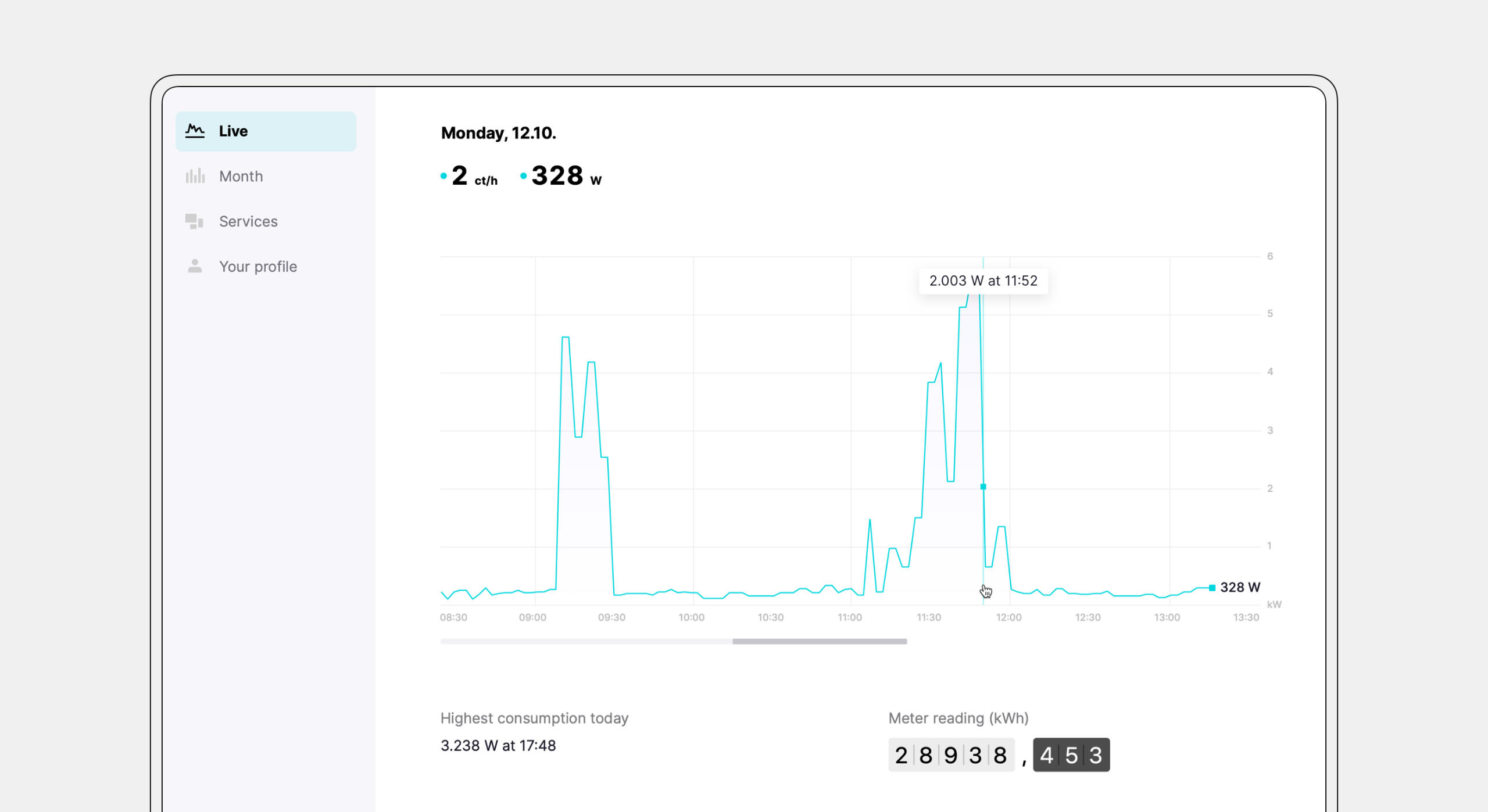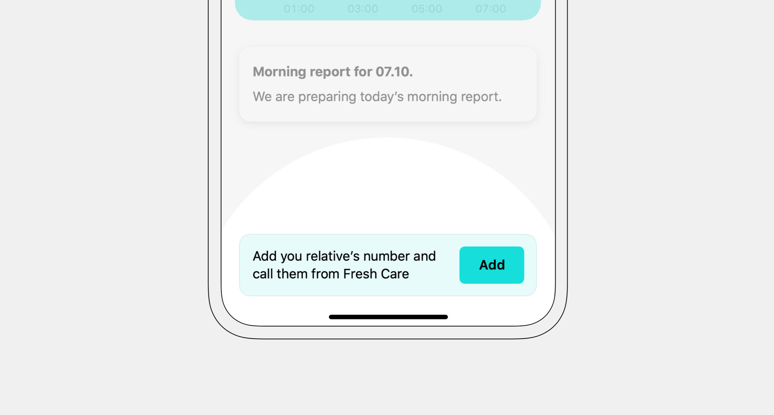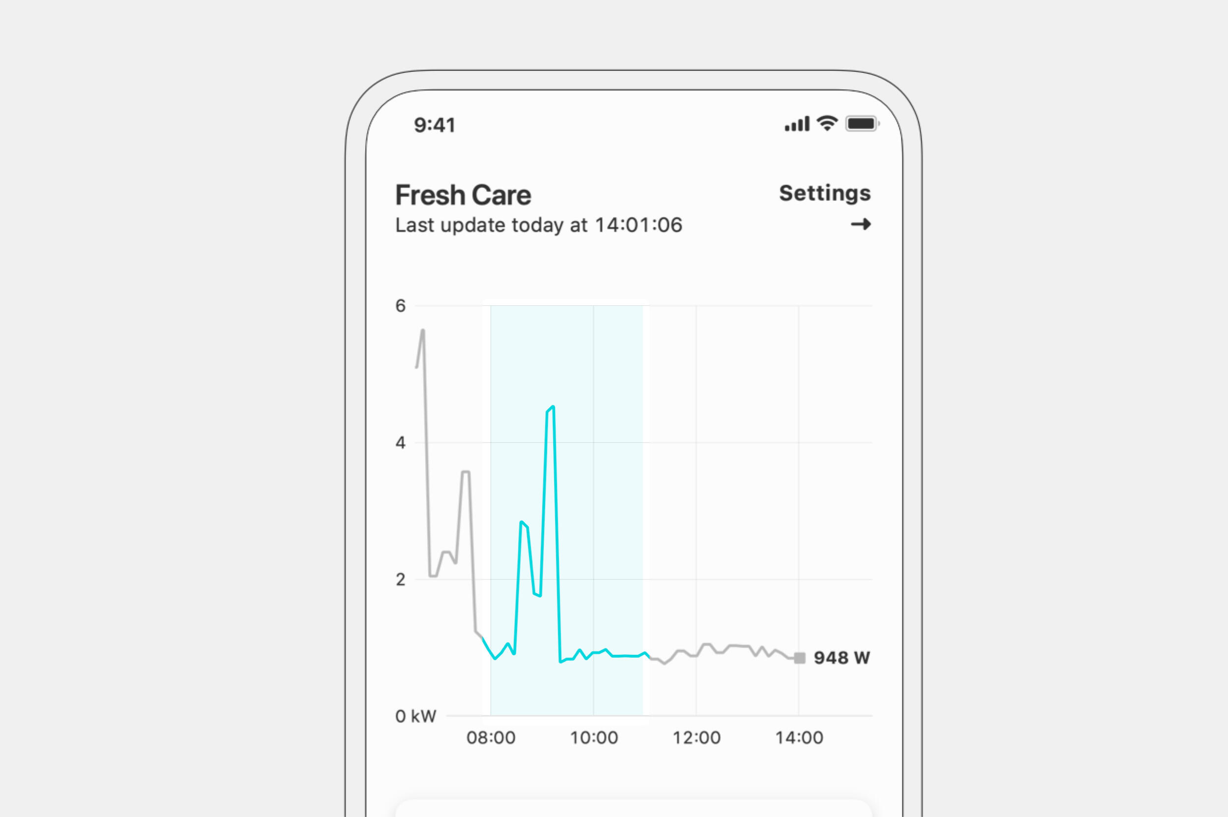 The live consumption graph lets users immediately notice anomalies. Daily activity reports provide end-users with a quick overview of the wellbeing of their senior relatives. If necessary, they can explore further on the graph, with the last 30 days of data availableFreshcare flow