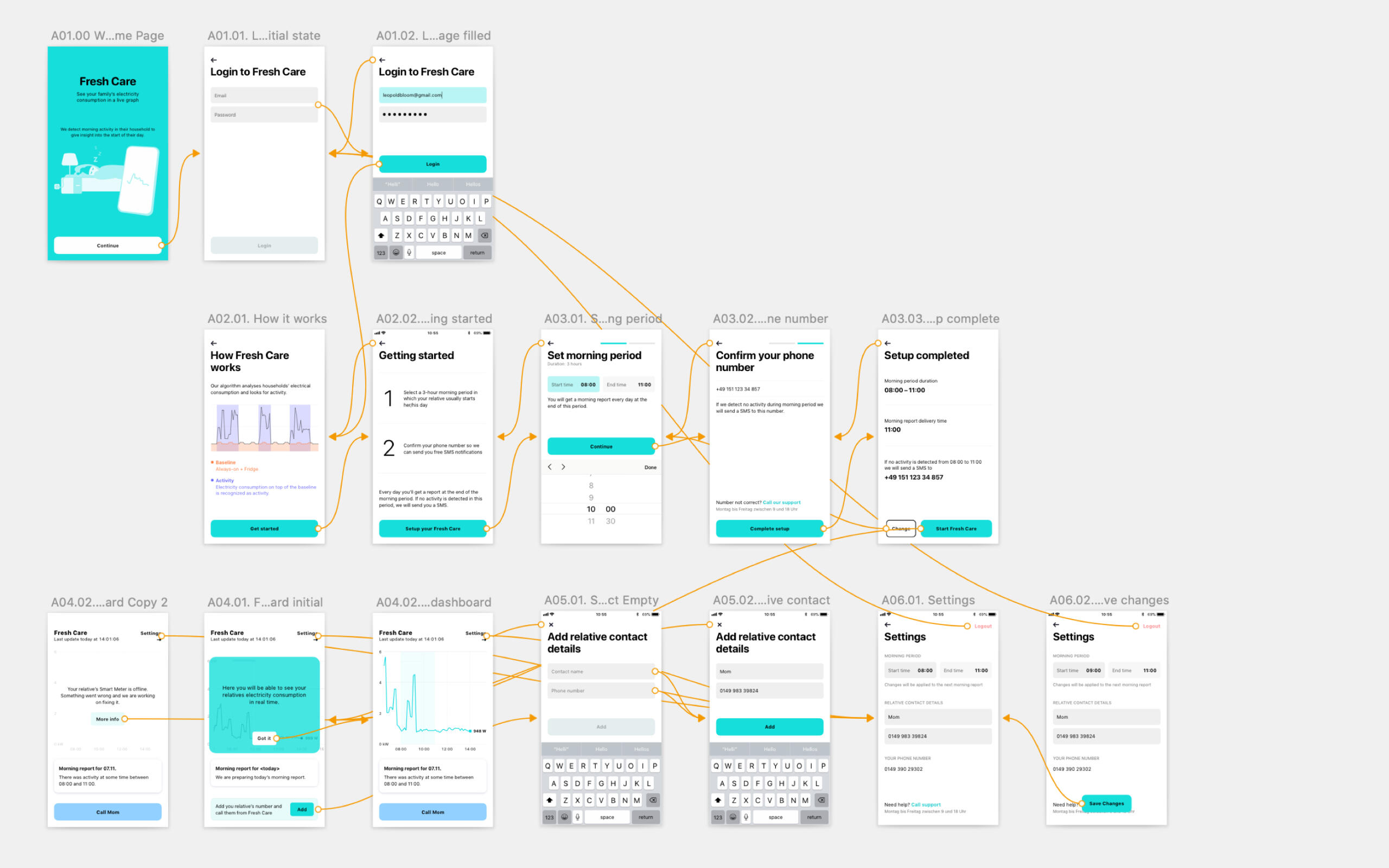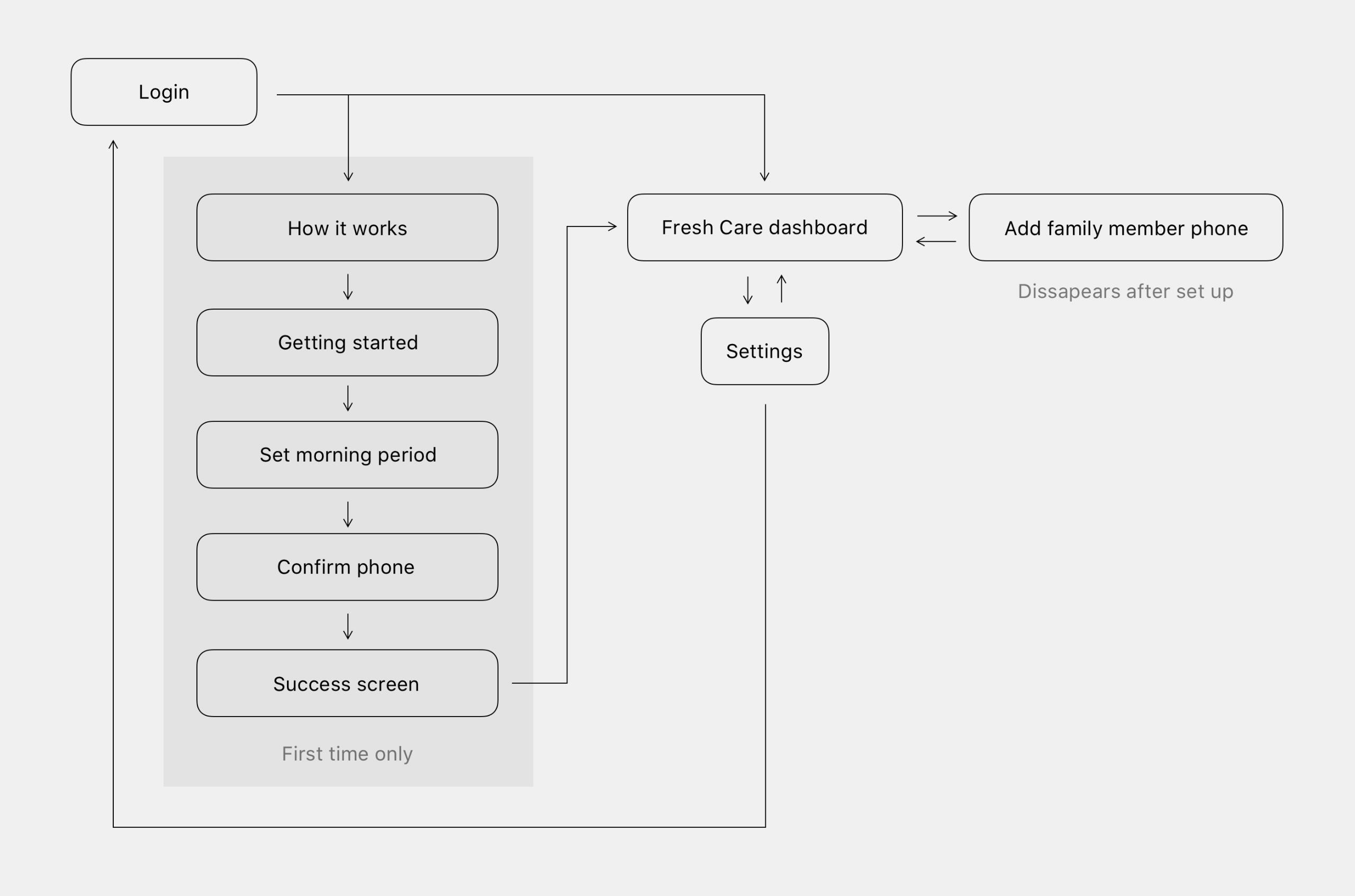 First, I facilitated workshops with the data science team to identify data and hardware limitations. Following that, user journeys (based on our personas) were used to define this innovative product within tight constraintsRESULTS- Our ideation and research identified mornings as the most critical time of day for seniors. The algorithm detects anomalous electricity use in the mornings, which may indicate well-being issues. Unlike competitors, Fresh Care needs no cameras or added hardware, so seniors feel independent and empowered. Family members receive SMS notifications about potential problems