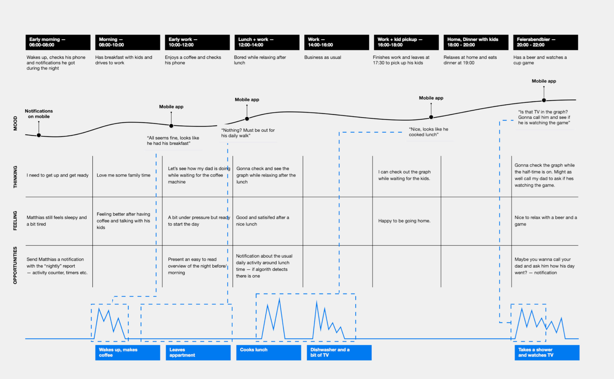 To define the product, we used personas and user journey maps. This helped us to pinpoint the morning as the most important time. Personas were based on family members of our pilot customers