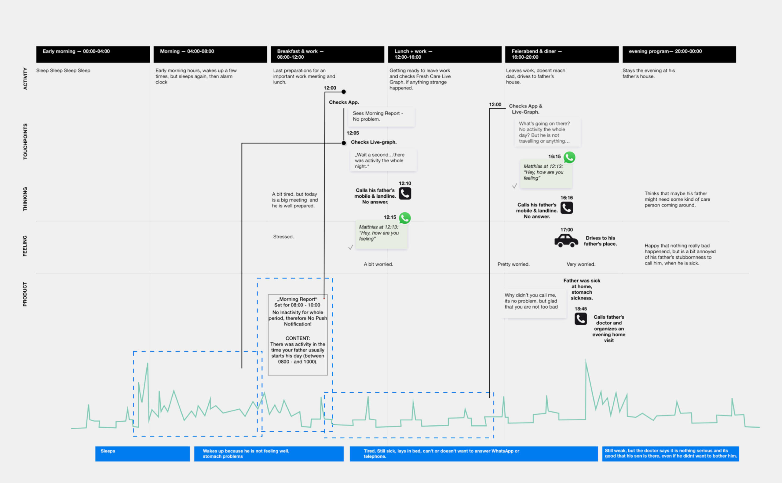 This journey follows our user throughout their day, focusing on their thoughts and action related to their senior relatives