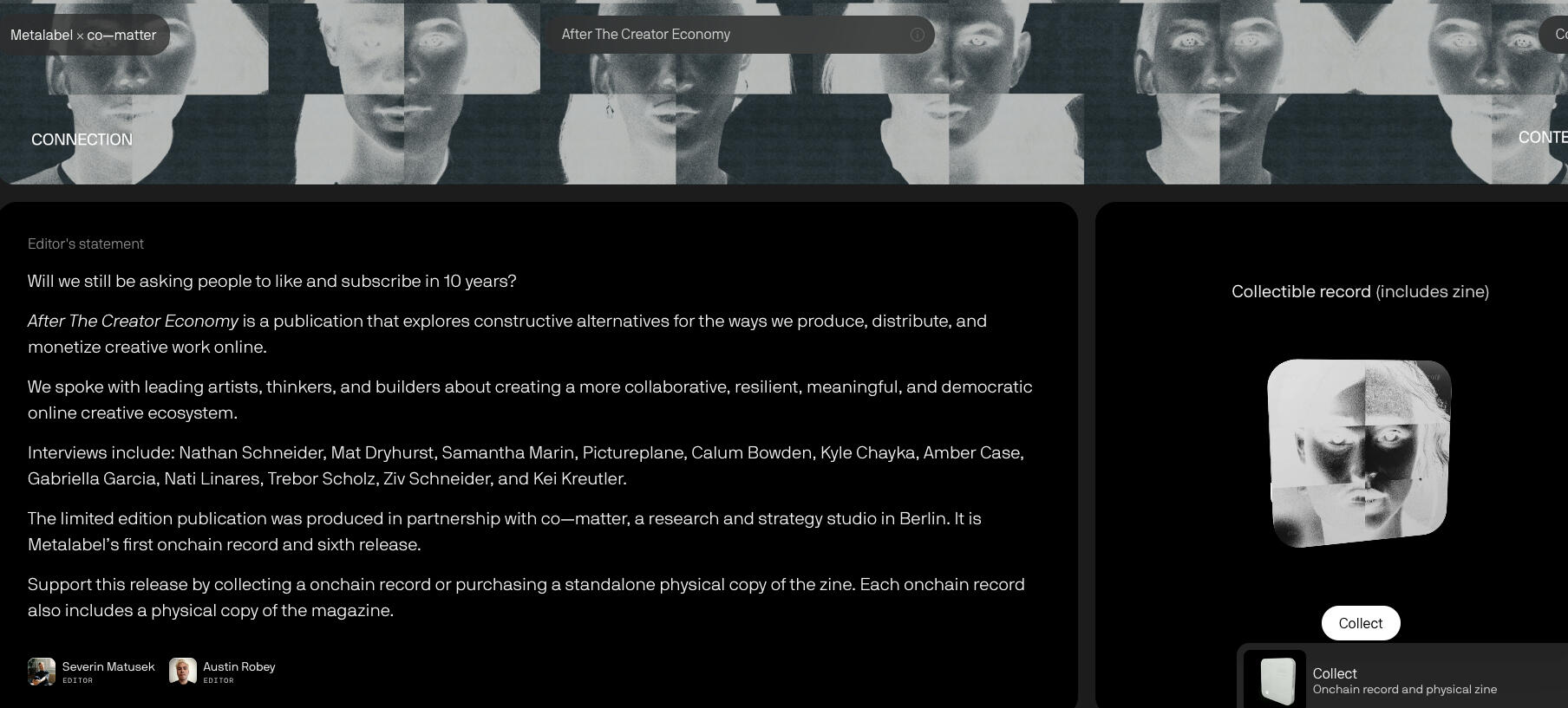 - Connect with followers, funders, and collaboratorsWe are CEO/Cofounder Yancey Strickler (Cofounder/ex-CEO Kickstarter), Executive Chairman/Cofounder Rob Kalin (Cofounder/ex-CEO Etsy), Product Lead Hitesh Kar, Design Lead Ilya Yudanov, and Community Advisor Austin Robey.Metalabel is a Web3-native product that operates across chains with foundations in Celo and Ethereum. We will launch with a multi-million dollar grant fund for new and existing labels. Learn more with a deep dive into culture labels and Metalabel.